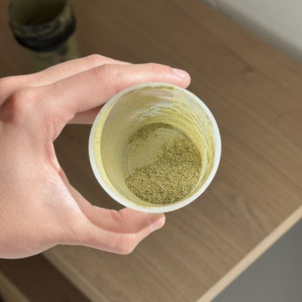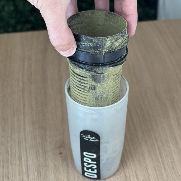 Agitá bien para separar el polvo de la yerba que vas a utilizar (la yerba queda en el filtro y el polvo en el vaso por si queres usarlo posteriormente)